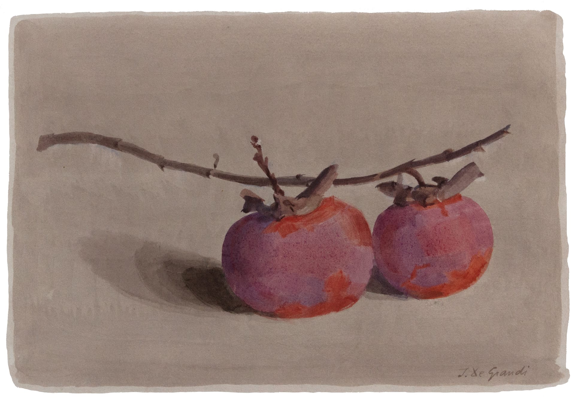 Italo pousse l’aquarelle aux limites du réalisme, rendant jusqu’au mat de la peau des kakis.