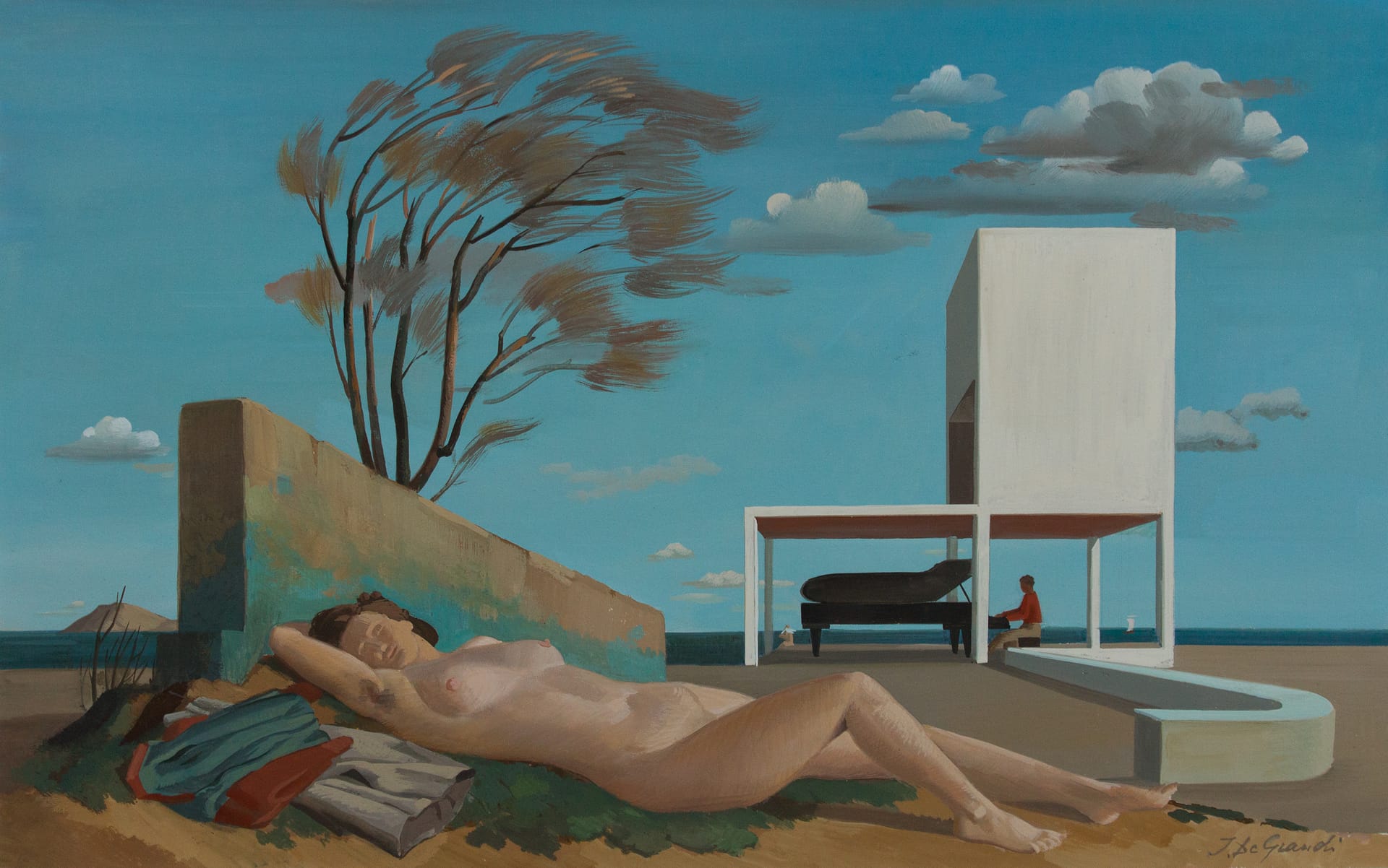Italo juxtapose deux personnages, l’un au premier plan, l’autre en arrière-plan, et les réunis par la surface de la plage et l’horizon marin. Mais cette union est dystopique, puisque les deux perspectives ne partagent pas le même point de fuite: c’est ce léger malaise optique qui confère à la scène son caractère onirique.