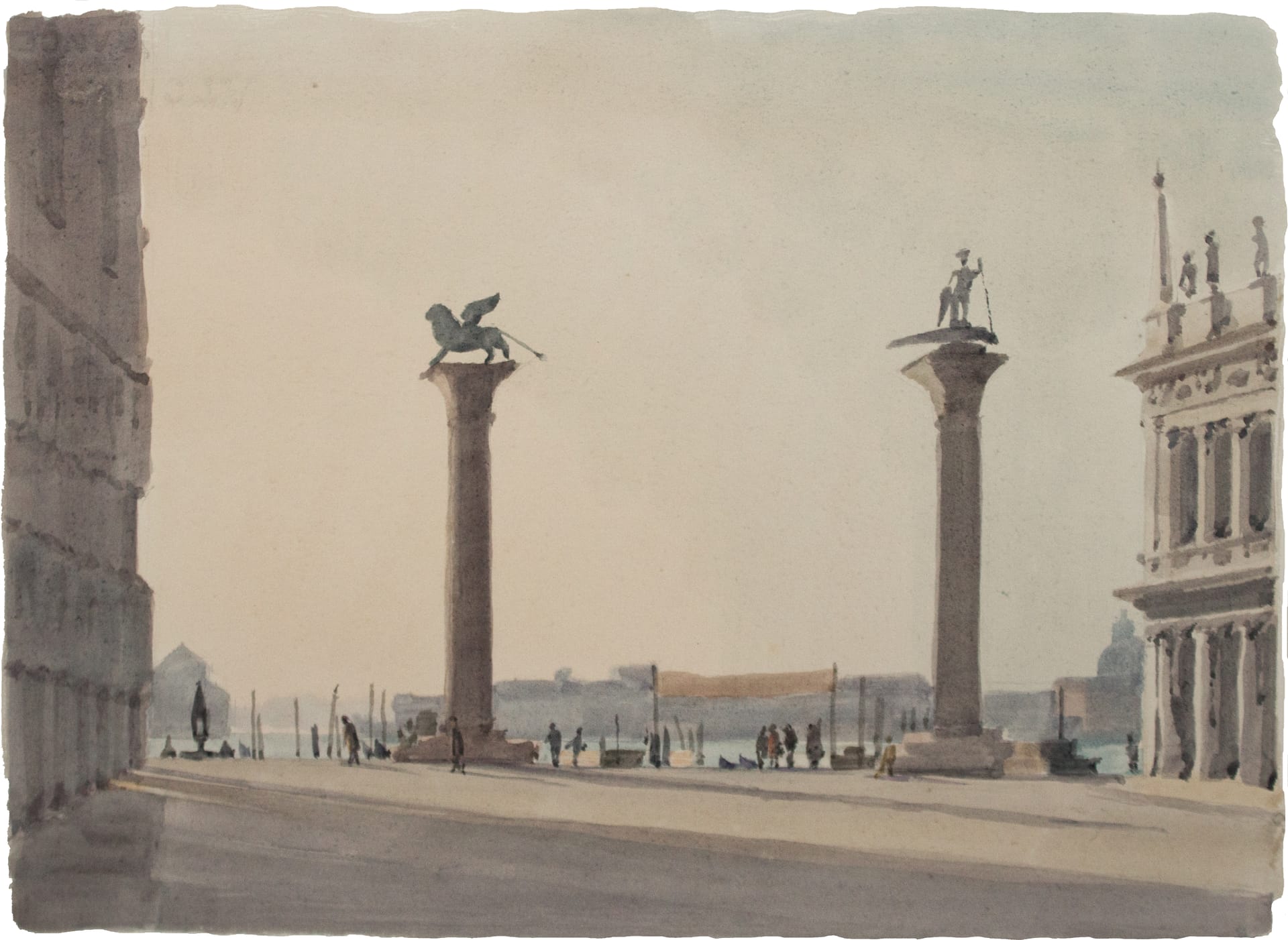 Italo place les éléments architecturaux (le sol de la place, la façade du Palais des Doges, celle de la Bibliothèque et les deux colonnes monumentales) de manière à cadrer l’essentiel de cette œuvre, à savoir la luminosité matinale du ciel.