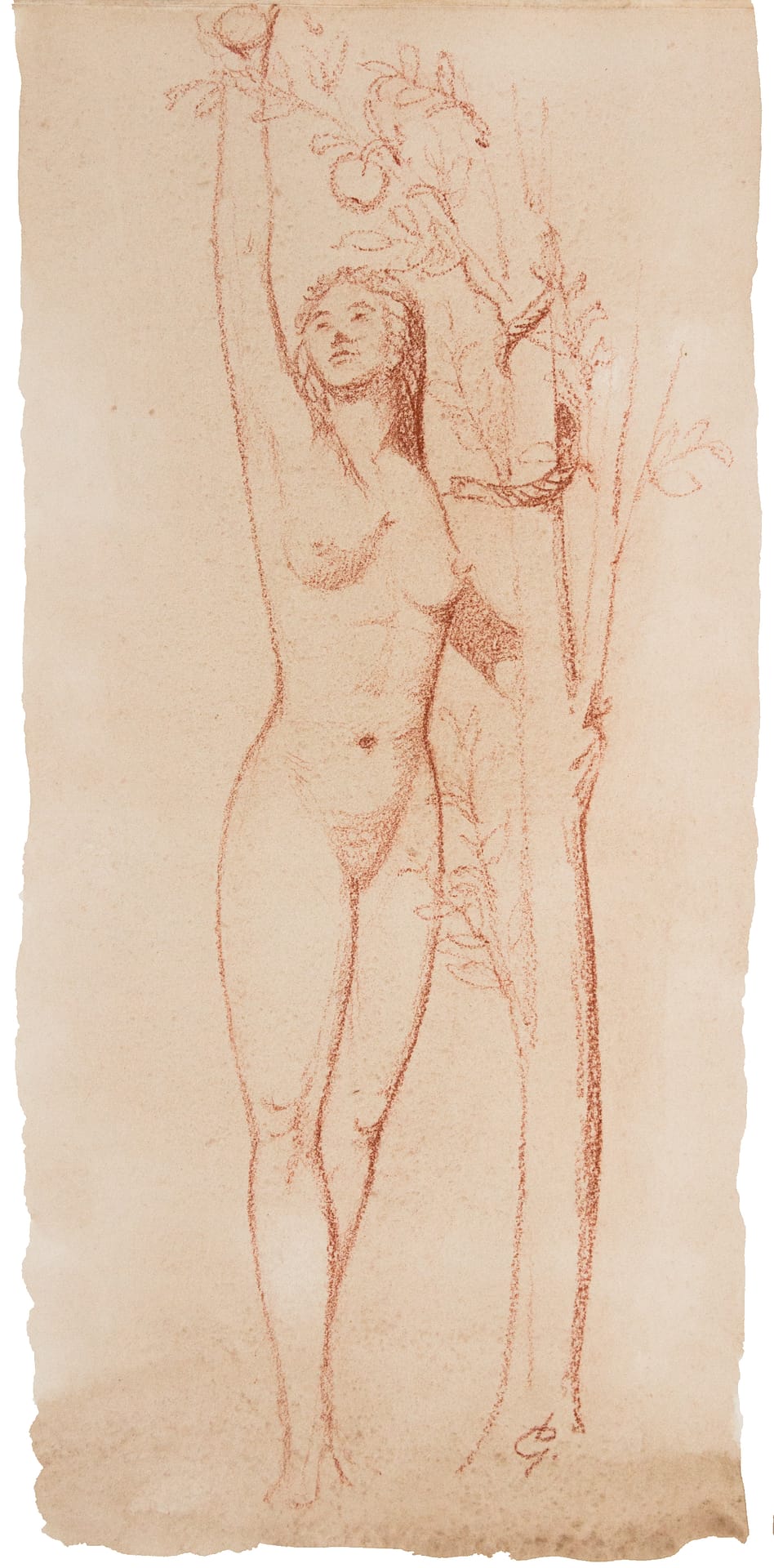 Pour ce nu Italo choisit la sanguine qui lui permet non seulement un rendu combinant un tracé minimal avec de délicates hachures quasi picturale, mais aussi de donner une certaine chaleur de ton à l’intimité de cette scène.