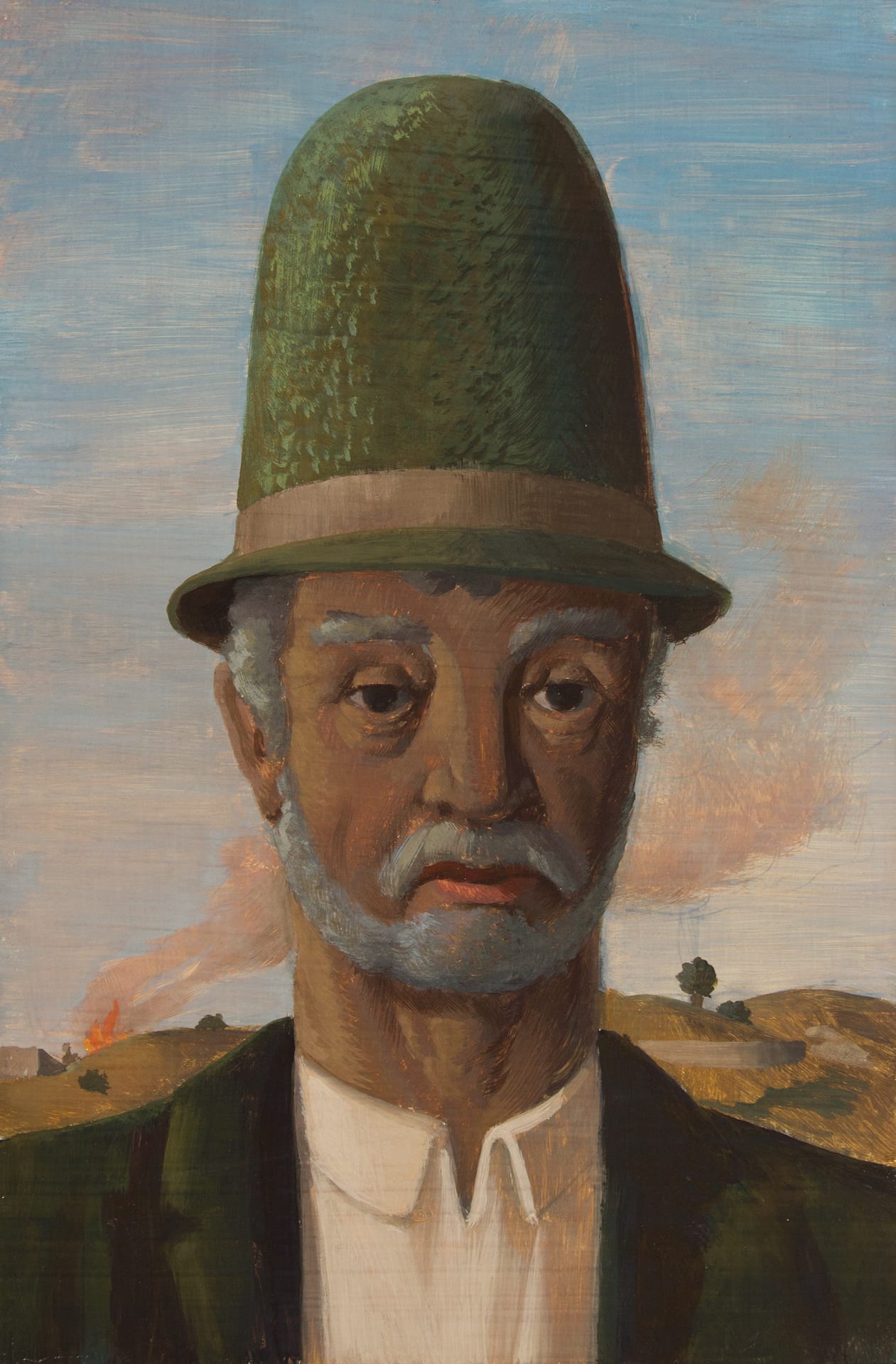 Le grand ovale, dans lequel s’inscrit le visage surmonté du chapeau, renforce l’importance de ce couvre chef, dont la démesure évoque la sagesse du personnage.