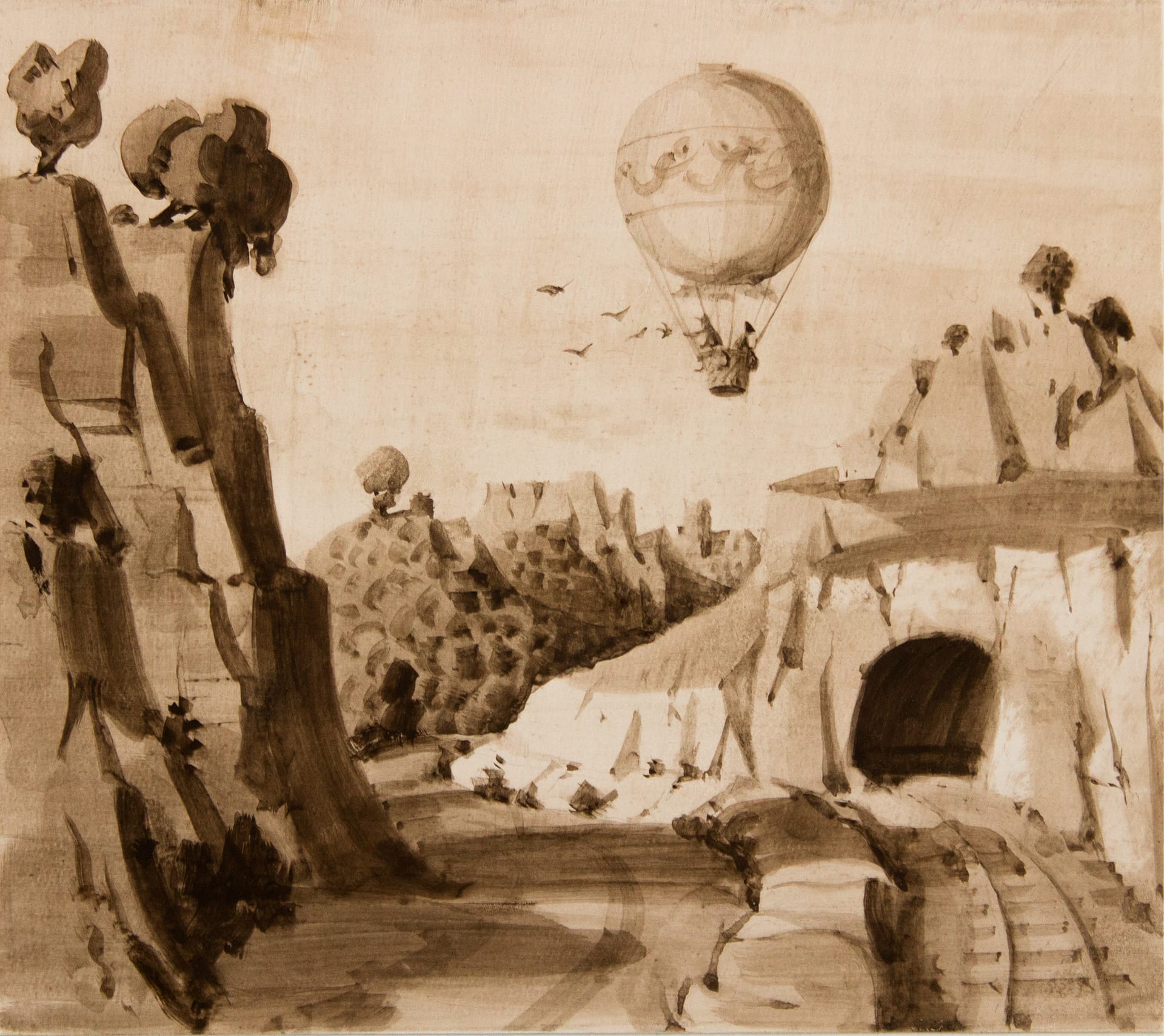 Les trois plans de rochers et collines s’enchaînent en perspective et déterminent ainsi deux cheminements : celui de la vallée, que semble suivre les voyageurs en ballon, et celui du tunnel que vont suivre (ou qu’on déjà suivi) les voyageurs en train …