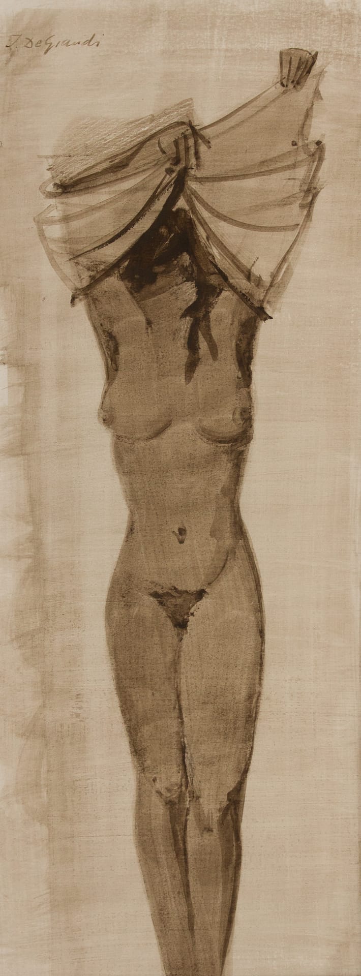 Bien qu’il s’agisse d’un lavis de tempéra monochrome, différents degrés de dilution dans l’eau et diverses phases de séchage et de superposition permettent au peintre de créer une atmosphère aux subtiles transparences. La touche est rapide et essentielle: elle suggère plus qu’elle ne dessine (en particulier dans la partie supérieure, les plis du vêtement et les mains).