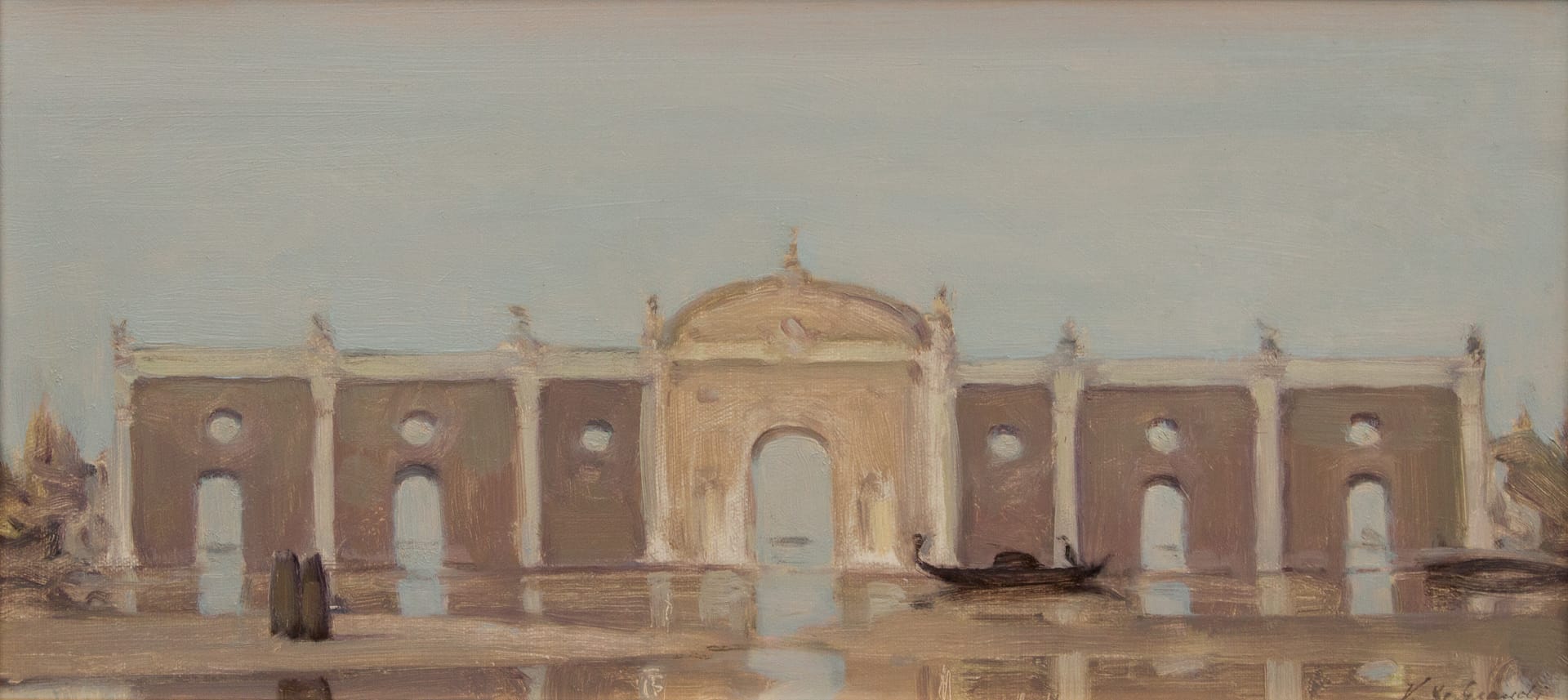 Portique imaginaire émergeant d’une lagune, accompagné d’une gondole et de personnages à l’accoutrement sombre réminiscents médecins soignant la peste à Venise en 1575.